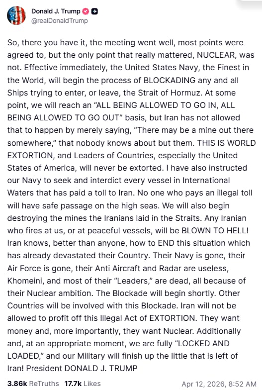 After a weekend of negotiations in Islamabad fell apart (JD Vance, Steve Witkoff, and Jared Kushner flew halfway around the world for nothing), Trump went straight to Truth Social with what can only be described as a Declaration of Naval War.